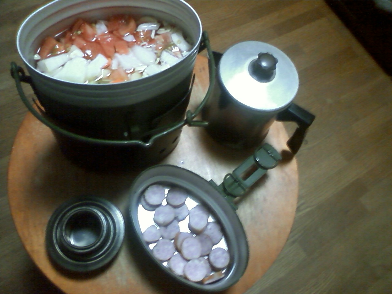 届いたばかりのスウェーデン軍飯盒と付属のトランギアを使って、食い物を作った。