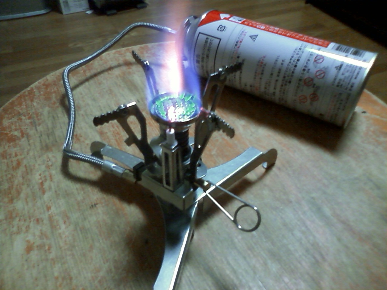 アウトドア用の、小さなガスバーナーを買った。ガス缶に直付けするタイプなのだが、アダプターでカセットガス缶で使ってみた。