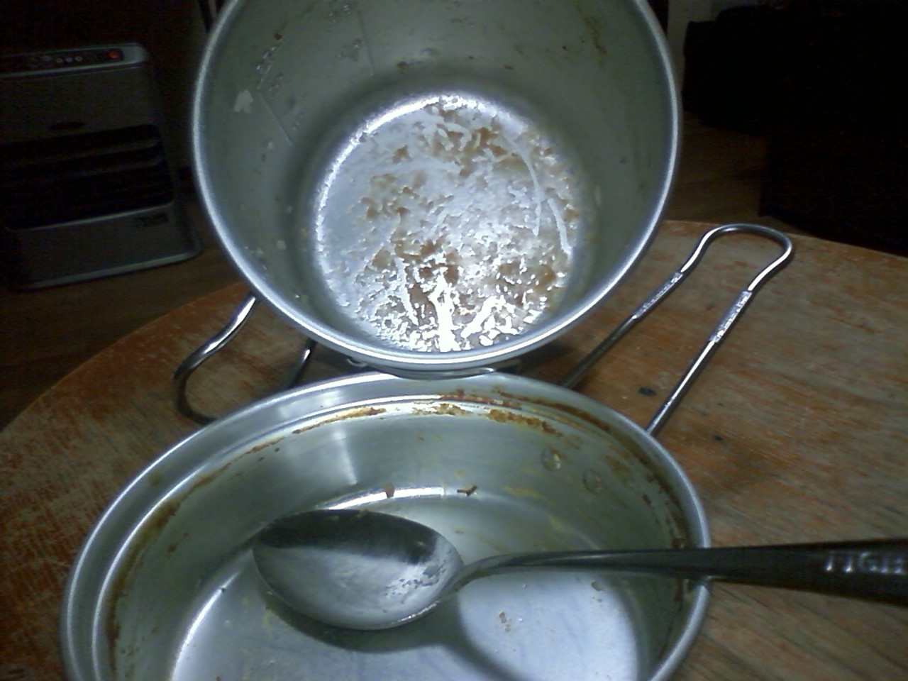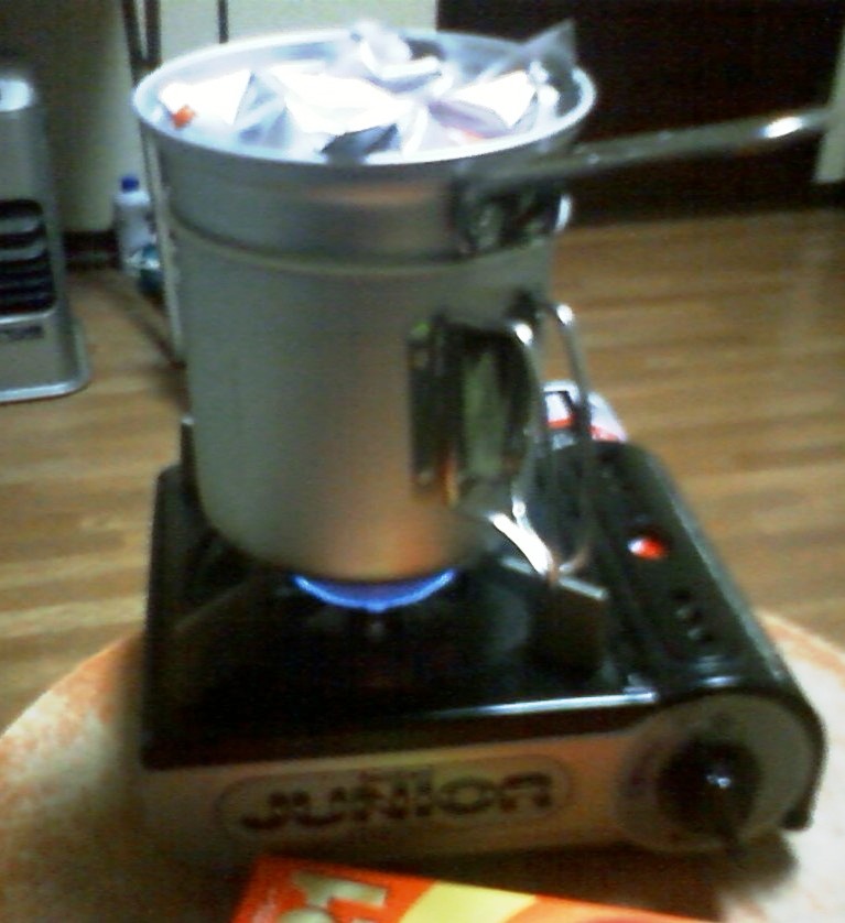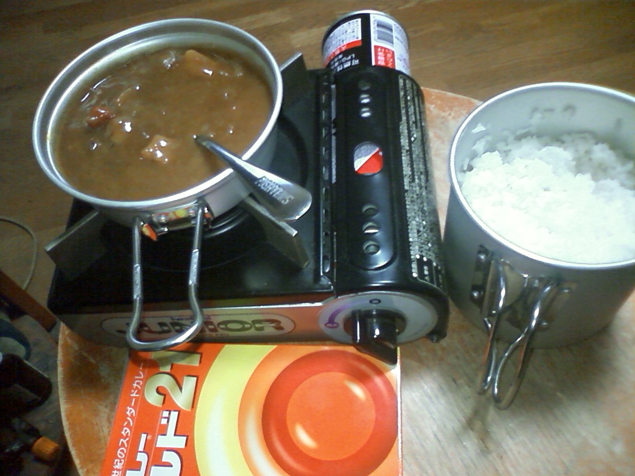 上の写真のとおり、小鍋の蓋を逆さまにかぶせてレトルトカレーを温めている。