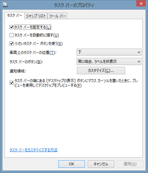 以下のようにダイアログで、下の方にある「タスクバーの端にある~~」にチェックを入れるのだ。