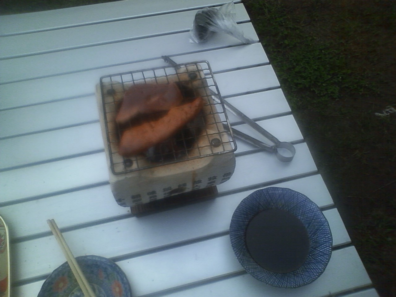 ところで、小雨が降り出す前には豚レバーを焼いていた。