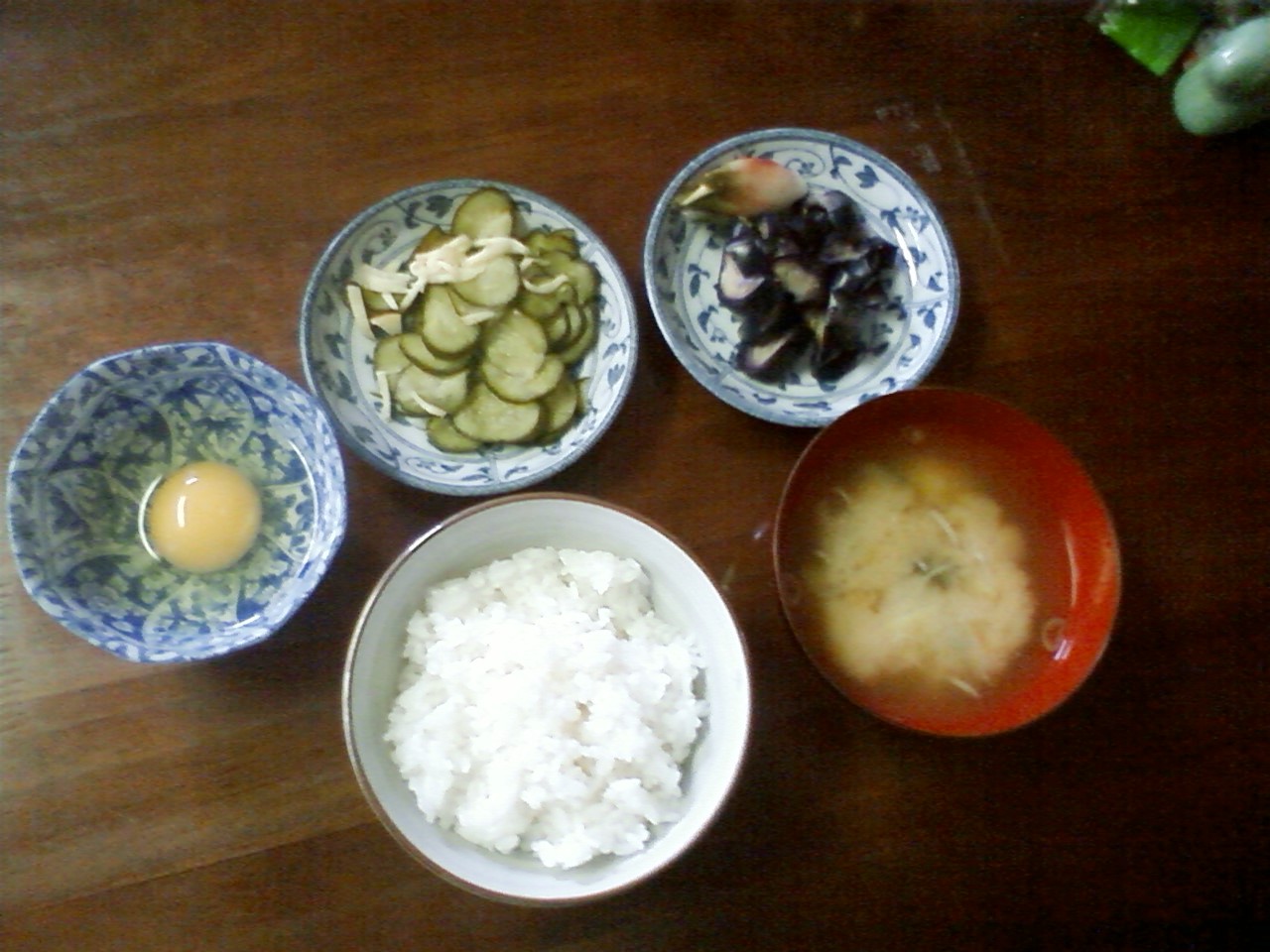 今朝のご飯は、空の様子とおなじで相変わらず・・・白米ご飯 生卵 キュウリの古漬け ナス漬け みそ汁(ジャガイモ、ニンジン、インゲン)