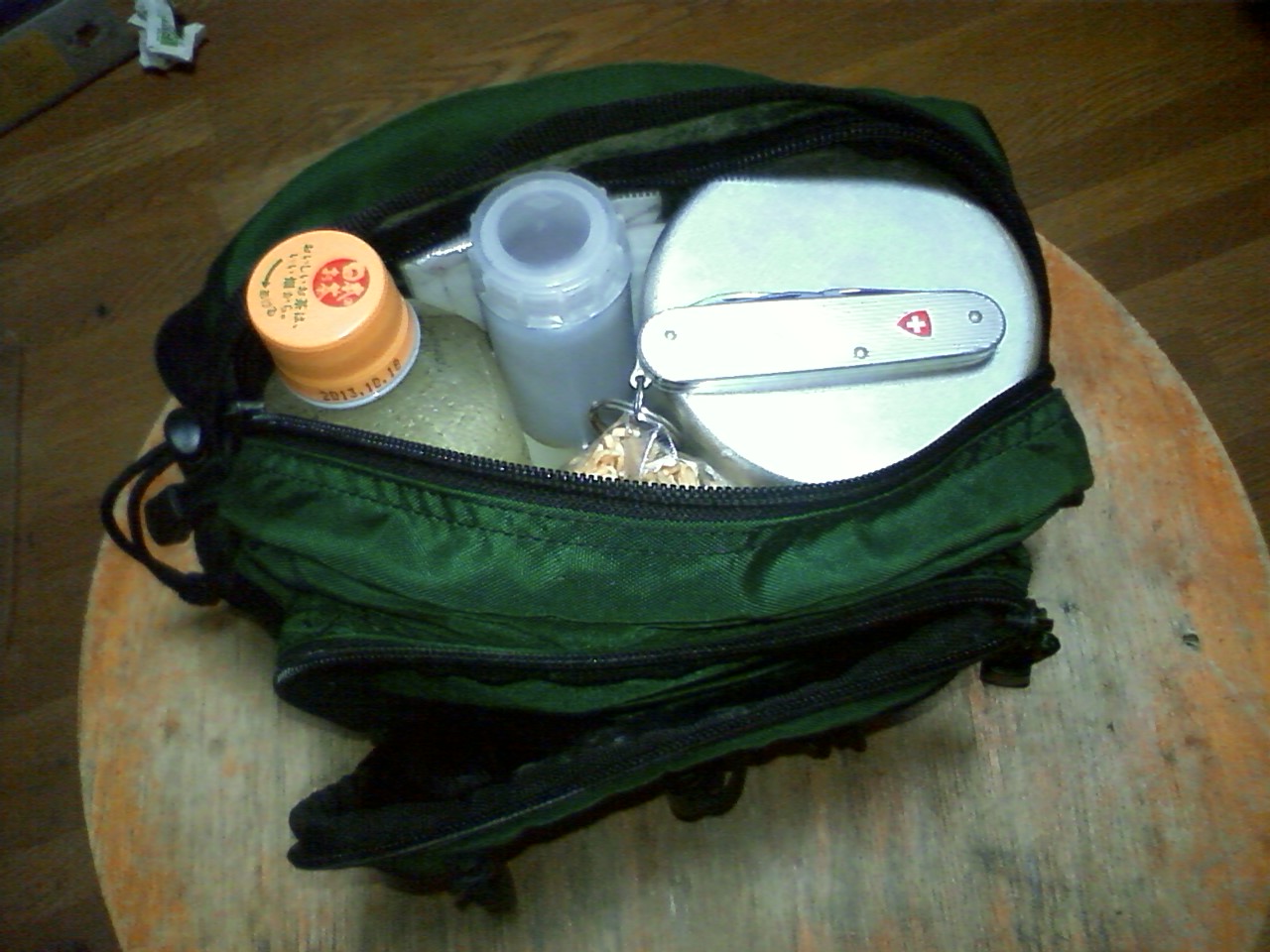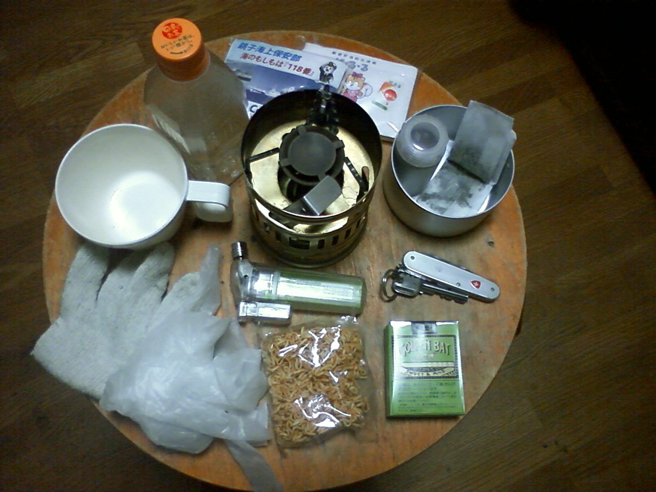 他には、風に強いターボライター、水道水を小さなペットボトルに入れたもの、行き先が川なので最小限度の量だ。