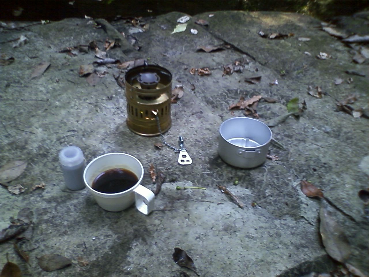プラスチック製カップ、インスタントコーヒーと漉し袋に入れた緑茶が飲料の基である。