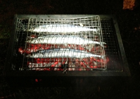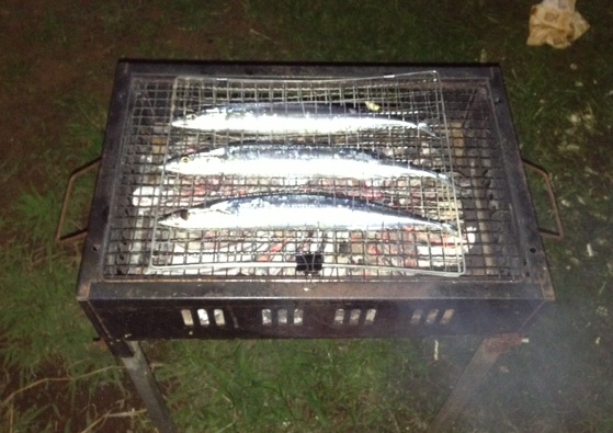 (網をひっくり返して、サンマの裏表に塩を振ること)