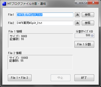 画面の下の方にある [File 1 + File 2] が、ファイルの連結を実行するボタンである。