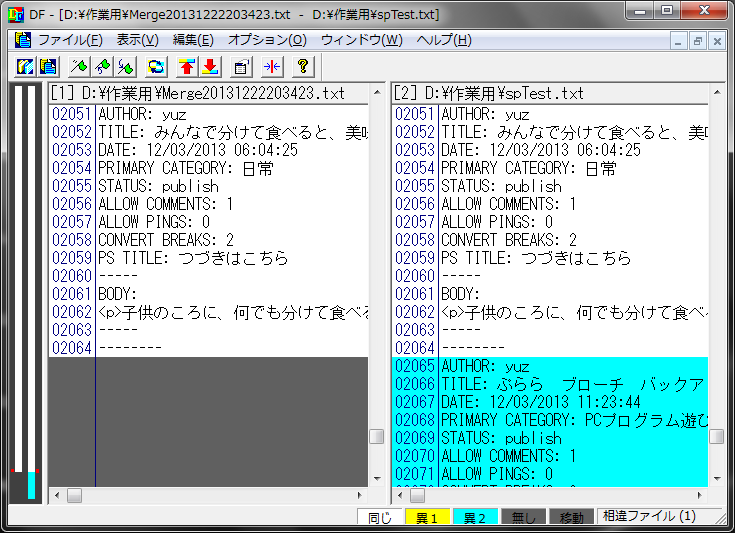 この画面のソフトはファイルの比較を行うもので、フリーソフトを借りている。