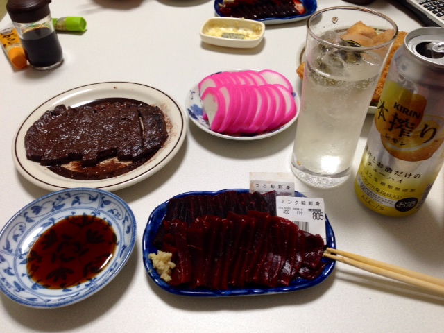 クジラを食べようと遠出して、ついでに刺身用を土産に買って来た。
