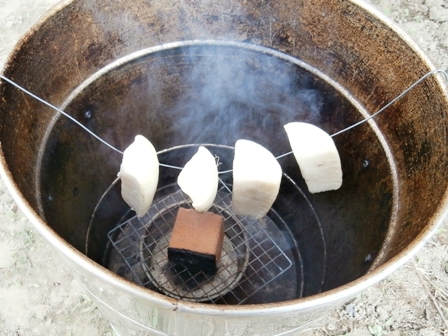 大根の糠を洗い流して、庭先で半日ほど自然の風で乾かして桜で燻す。